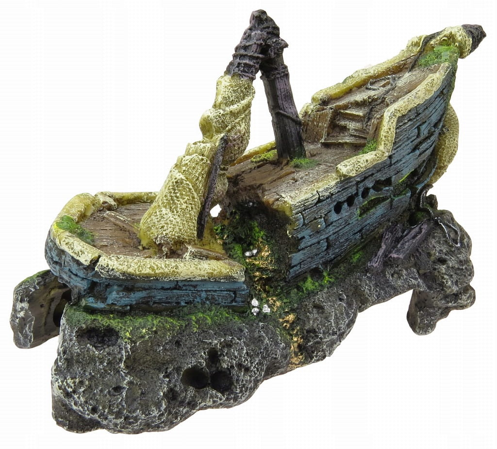 Dekoracja do akwarium przedstawiająca wrak łodzi. Wrak statku z połamanymi masztami został ukazany na skale. Ręcznie malowana figurka z dbałością o detale. Ubogaci każdy zbiornik wodny. Stworzona z bezpiecznego dla ryb i innych osobników zamieszkujących akwarium tworzywa. Żywica poliestrowa to nietoksyczny materiał, przyjazny dla wodnego środowiska. Wrak statku może być stosowany w akwarystyce słodkowodnej oraz morskiej.