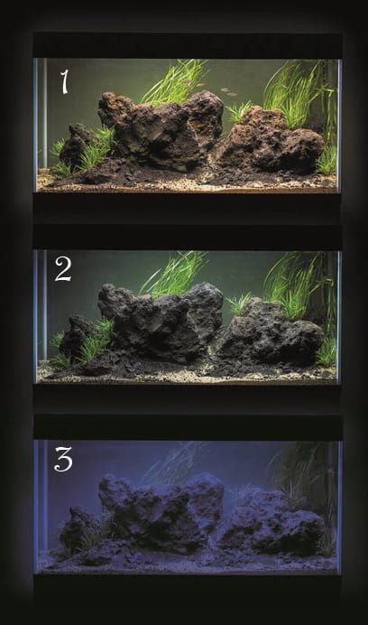 tryb NIGHT – niebieska poświata pozwalająca na unikalną obserwację akwarium po zmroku, w tym ryb i zwierząt o nocnym trybie życia