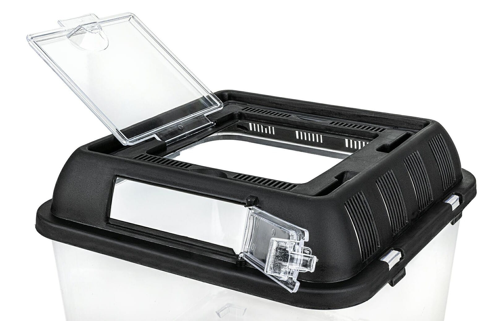 Dla ułatwienia obsługi, pokrywa wyposażona jest w przezroczyste drzwiczki z blokadą, uniemożliwiającą ucieczkę z pojemnika, oraz uchwyt dla łatwiejszego przenoszenia.