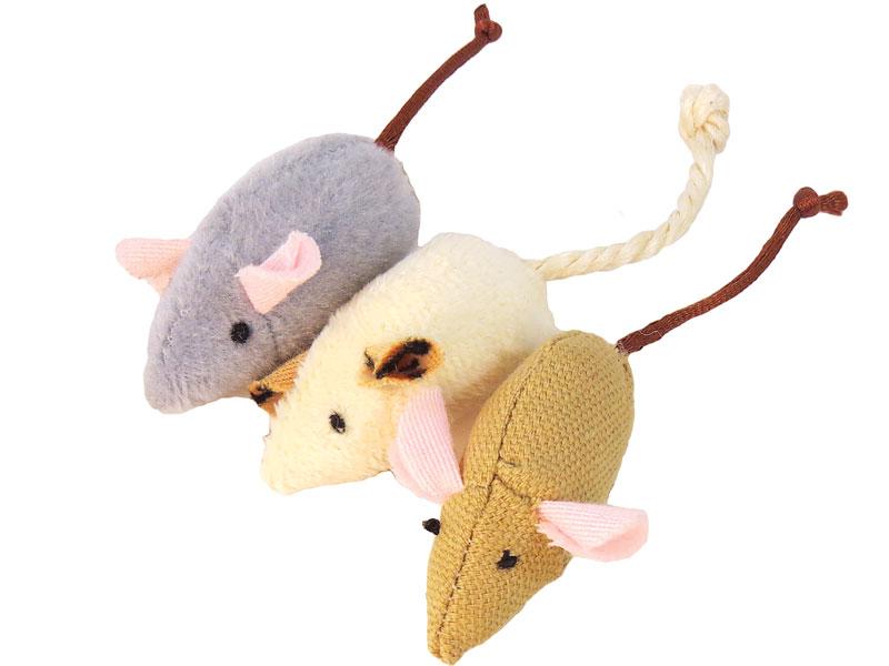 Zestaw trzech uroczych myszek, które z pewnością przypadną do gustu każdego kota i wzbudzą w nim chęć do radosnych figli. Zabawki wykonane są z miękkiego i wytrzymałego pluszu, odpornego na kocie pazurki i ząbki. Na końcach mysich ogonów, wykonanych z trwałego sznurka znajdują się supełki, dzięki czemu sa one jeszcze bardziej wytrzymałe.