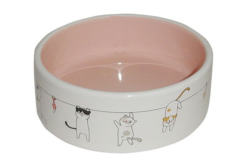 Klasyczna miska ceramiczna dla kota, biała z wesołym rysunkiem kotów i jasnoróżowym środkiem. Wymiary 12,5X4,5cm. Idealna na wodę, karmę mokrą i suchą.