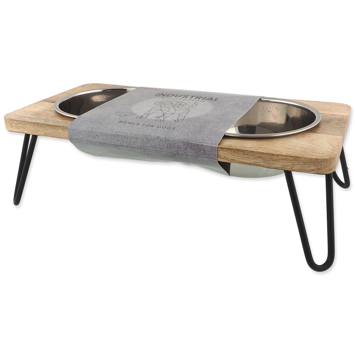 Praktyczny zestaw dwóch misek ze stali nierdzewnej w eleganckim drewnianym stojaku z żelazną konstrukcją. Idealne rozwiązanie do serwowania wody i jedzenia, łączące funkcjonalność i nowoczesny design.