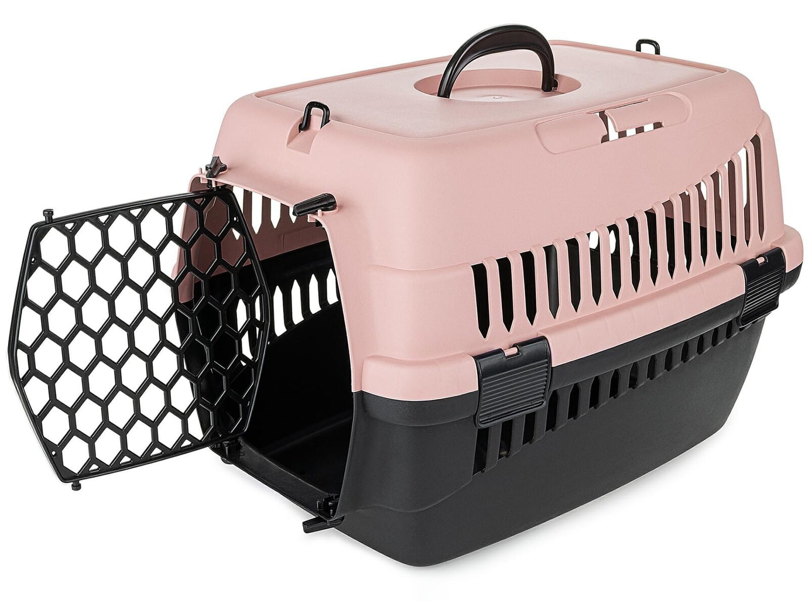 Transporter jest wygodny również w otwieraniu i zamykaniu- przednia krata zdejmuje się całkowicie, łatwo ją z powrotem zamontować. W razie potrzeby w transporterze można odpiąć również całą górę, która jest przymocowana na proste klipsy.