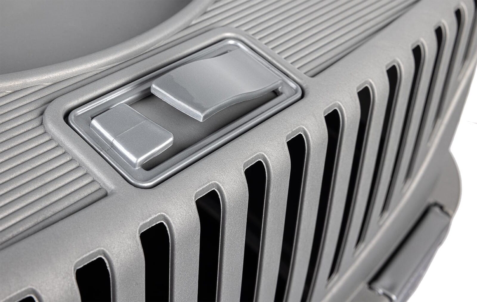Transporter jest wygodny również w otwieraniu i zamykaniu - przednia krata zdejmuje się całkowicie, łatwo ją z powrotem zamontować. W razie potrzeby w transporterze można odpiąć również całą górę, która jest przymocowana na proste klipsy.