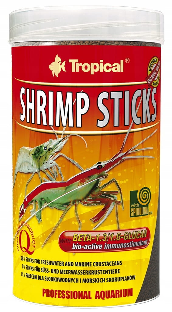 SHRIMP STICKS pałeczki dla słodkowodnych i morskich skorupiaków. Wieloskładnikowy pokarm w formie tonących pałeczek, przeznaczony do codziennego karmienia skorupiaków słodkowodnych i morskich, w tym niezwykle popularnych słodkowodnych krewetek karłowatych. Obecna w pokarmie spirulina jest źródłem cennych witamin i substancji czynnych, które wraz z naturalnym immunostymulatorem – beta-glukanem aktywują układ odpornościowy skorupiaków, zwiększając ich odporność na choroby. Pokarm Shrimp Sticks został wzbogacony w naturalne barwniki z grupy karotenoidów, w tym astaksantynę. Ich obecność wpływa na utrzymanie skorupiaków w doskonałej kondycji, wzmocnienie ich wybarwienia oraz prawidłowy przebieg procesu linienia.
